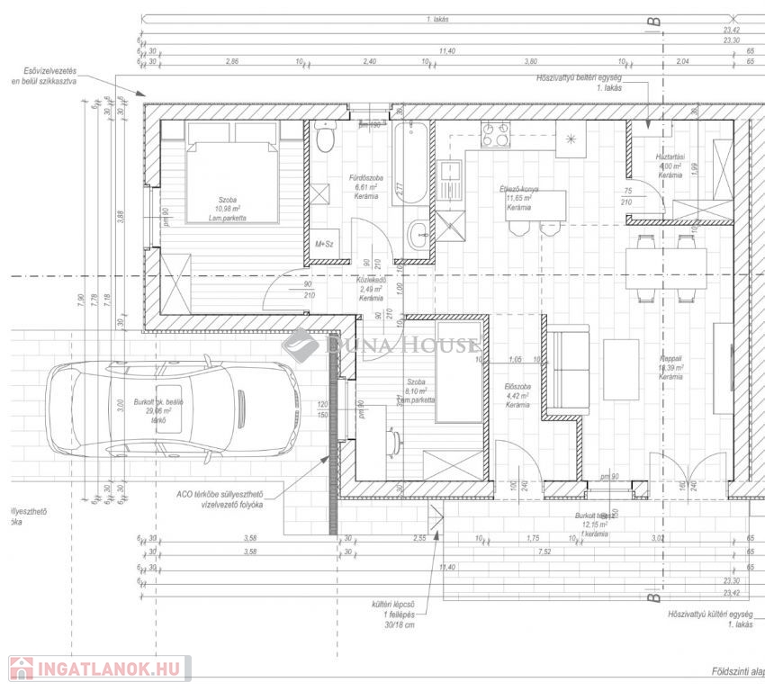 Kialakítása: 2 szoba, tágas amerikai nappali konyha, háztartási helyiség, előtér, közlekedő, fürdő+wc, nyitott terasz.