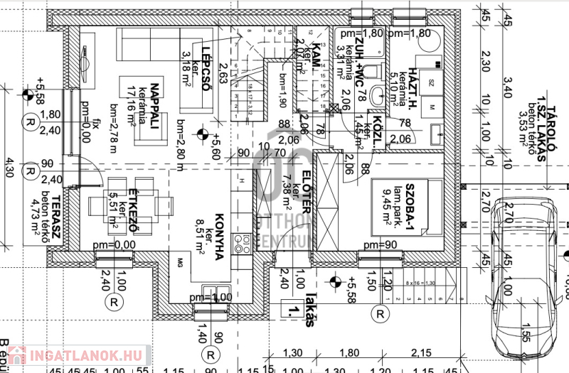 Földszinten: tágas nappali-étkező-konyha, hálószoba, fürdő, háztartási helyiség, kamra