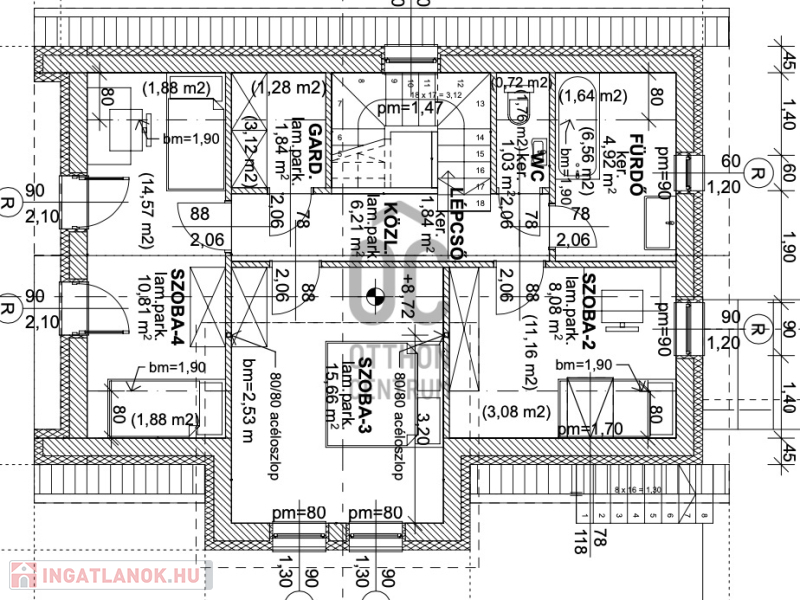 Emeleten: három hálószoba, gardrób és fürdőszoba