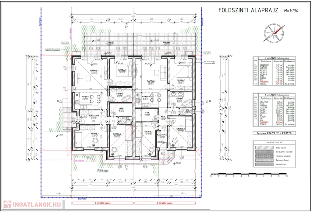 Az egyik ikerfél nettó 87,12 m² hasznos alapterülettel és 19,5 m²-es terasszal , a másik 86,32 m² nettó alapterülettel és 24,6 m²-es terasszal rendelkezik. A bal oldali lakáshoz 433 m²-es, a jobb oldalihoz 302 m²-es telekrész tartozik.