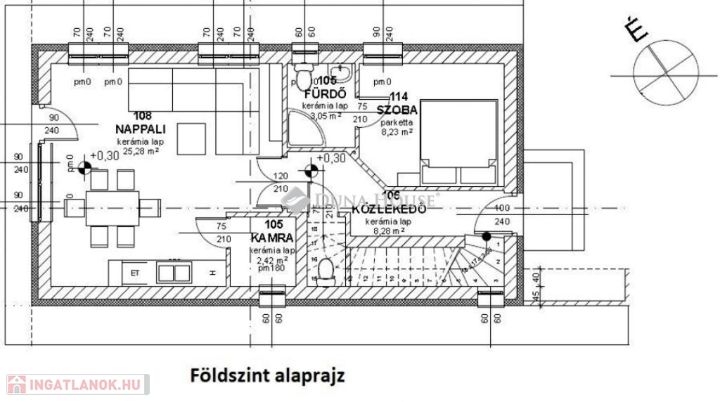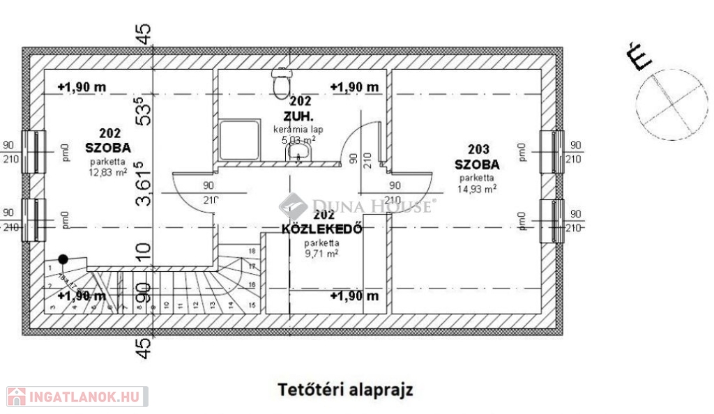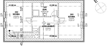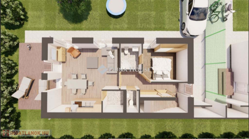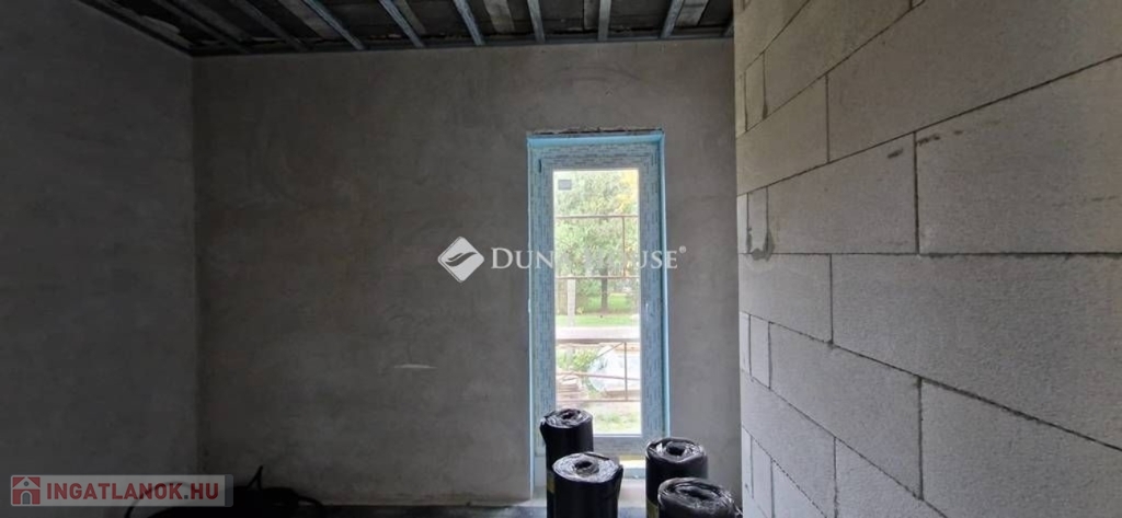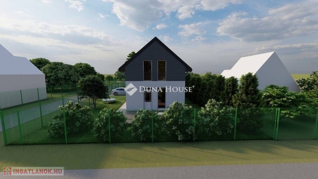 Egy telken belül - megosztott használatban - két egyforma ház épül. Ehhez az ingatlanhoz 234 négyzetméter alapterület tartozik. A telken elhelyezkedő ház 103 négyzetméter. Két szintet kapott. Az alsó szinten kialakításra került egy nappali + konyha, egy szoba,  fürdőszoba + WC,  közlekedő, illetve egy kamra. A nappaliból nyílik a terasz, ami 18 négyzetméteres. A lépcsőn feljutunk a tetőtér közlekedőjébe, ahonnan külön nyílik két szoba, illetve egy zuhanyzó + WC.