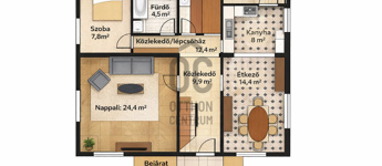 A ház legnagyobb előnye a tér és a praktikus elrendezés. A világos helyiségek és a jól elkülönülő életterek minden családtagnak kényelmes életteret biztosítanak.