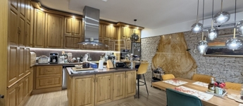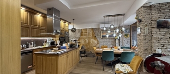 Három szint, 400m2: Pince, földszint és tetőtér-beépítésű „U” alakú lakóépület, Összesen 7 teljes értékű szobával, mindegyikhez fürdőszoba és gardrób tartozik, központi tágas konyha étkezővel, szalon, nappalival, télikert, tárgyaló, boltíves borospincével, teraszokkal.