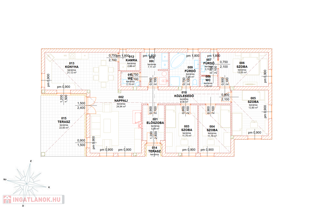 A ház nagy családosoknak készült, ezért van benne az amerikai konyhás nappalin kívül még 4 külön hálószoba, 2 fürdőszoba, plussz egy külön WC a háztartási helyiséggel együtt. Udvar felől egy nagy, 22 négyzetméteres fedett terasz is lehetőséget nyújt a szabadban való pihenésre.