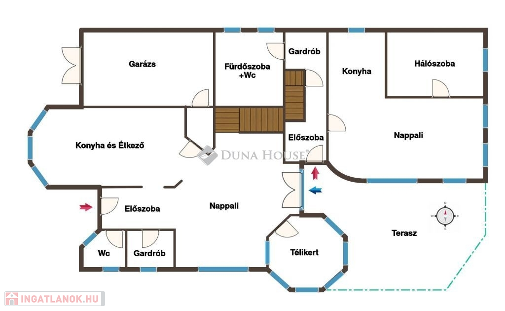 A középső szint az utca felől földszinti, a kert felé emeleti elhelyezkedésű. Itt két lakrész kapott helyet, melyek közül a nagyobbikhoz az épület felső szintje is csatlakozik. A nagyobbik lakrész központját egy tágas nappaliszoba adja, melyből vele egy légteret képező konyha-étkező, továbbá egy hangulatos, csupa ablak télikert, egy mosdó, wc, és egy gardróbszoba helyiségek nyílnak. Innen egy tágas, panorámás teraszra léphetünk ki a kert irányába. A felső szintre vezető lépcső a nappaliból elérhető. A kisebbik lakrész a kert és a terasz felől, külön bejárattal elérhető, nappali, hálószoba, konyha, előszoba, és egy fürdőszoba helyiségek alkotják.