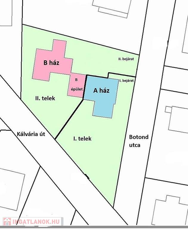 - A telken kettő családi ház van, ügyvédileg megosztva, a két családi ház között egy téglaépület helyezkedik el, ami elválasztja a két házat egymástól. Az értékesítendő ingatlan az A betűvel jelzett családi házról szól.