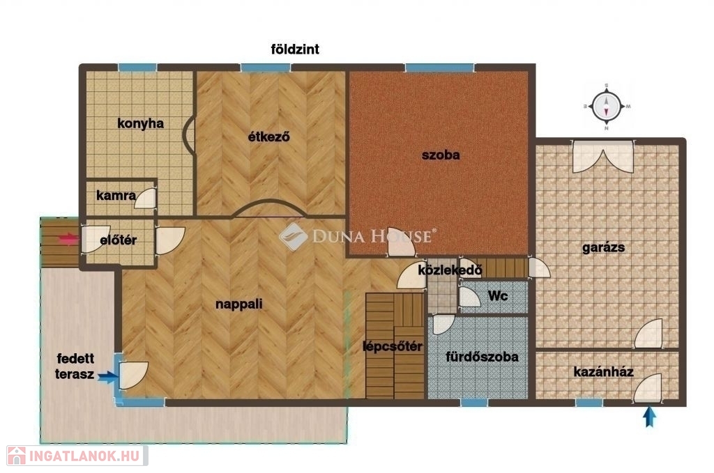 Földszint: nappali étkező hálószoba konyha kamra előszoba fürdőszoba külön Wc garázs kazánház.