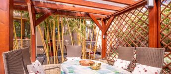 A zárt jakuzzi a kertben külön épületben helyezkedik el, előtte fedett terasz található.