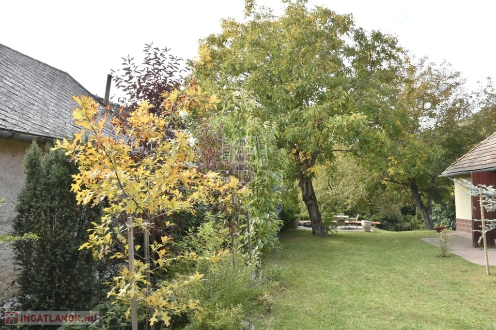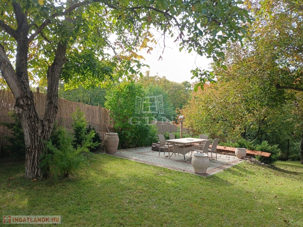 A gondosan megtervezett udvarban gyümölcsfák, bokrok, örökzöldek és virágok teszik idillivé a környezetet. Egy mediterrán hangulatú, fedetlen szaletli hív pihenésre, a telek alján pedig egy kis patak csörgedezik, tovább fokozva a természetközeli atmoszférát.