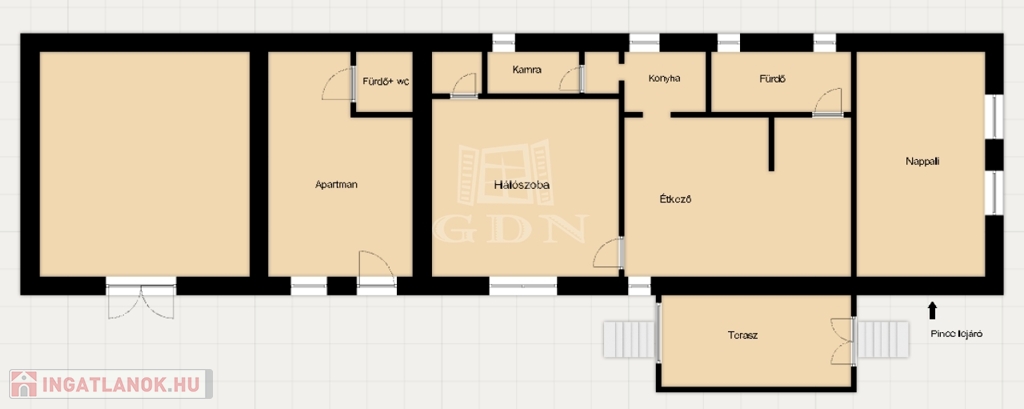A telken található egy teljesen elkészült, külön bejáratú apartman, amely vendégházként, irodaként vagy akár kiadásra is ideális lehet.