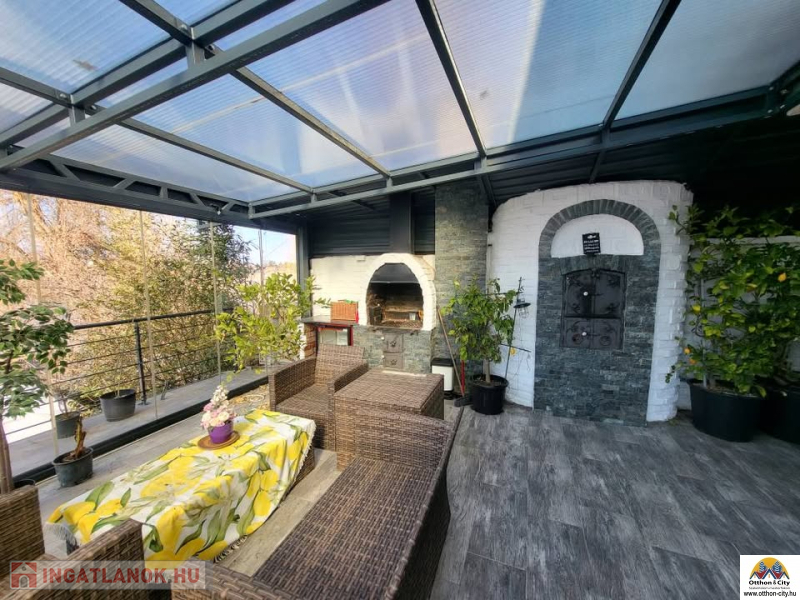 Terasz 45m², amely fűthető. Itt került kialakításra, egy gyönyörű kemence, és egy grillező is, illetve egy 6 személyes yakuzzi. Teljesen körbevont üveggel, de tetszés szerint eltolhatóak, így nyitott terasz is lehet. Télen-nyáron biztosítja a kényelmes családi összejöveteleket.