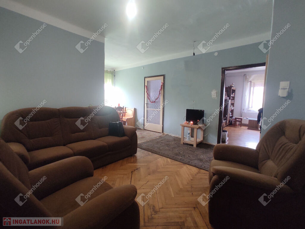 Belső elrendezése jelen kialakításában: előszoba-közlekedő, étkező, nappali, konyha, fürdőszoba, három külön nyíló kényelmes méretű szoba.