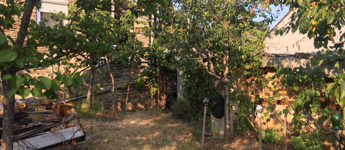 A telek 529 m2-es, enyhén lejtő. Két utcából is megközelíthető. Két autó parkolását biztosítja a kert végében elhelyezett fedett beálló. A kertben termő gyümölcsfák állnak.