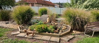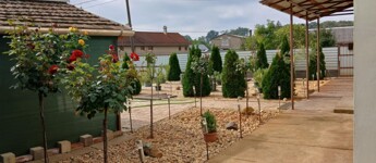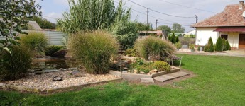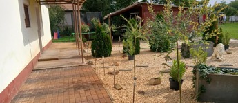 A kialakított kertjében bőven van hely a sok – sok kialakított virágsziget számára, mely kifejezetten üdítő, kellemes, környezetet kínál lakóinak, többnyire gondozásmentes kialakítású, így sikerült élménygazdaggá tenni. A viszonylag kevés időráfordítás vs több pihentető szabadidő. A gyümölcsös kert pedig szezonálisan friss gyümölccsel látja el családját.