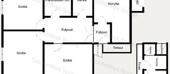- a családi ház helyiségei: előtér, konyha, közlekedő, 3 egész szoba, fürdőszoba + WC, terasz,