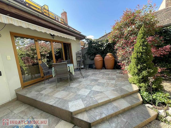 A házhoz tartozik egy kb. 100 nm-es, gondozott kert öntözőrendszerrel, egy 14nm-es garázs, illetve extraként egy infra szauna. A földszinten egy 20 nm-es terasz, a második emeleten egy 7 nm-es erkély, míg a harmadik szinten egy 9 nm-es panorámás terasz biztosít kellemes kikapcsolódási lehetőséget és szép kilátást.