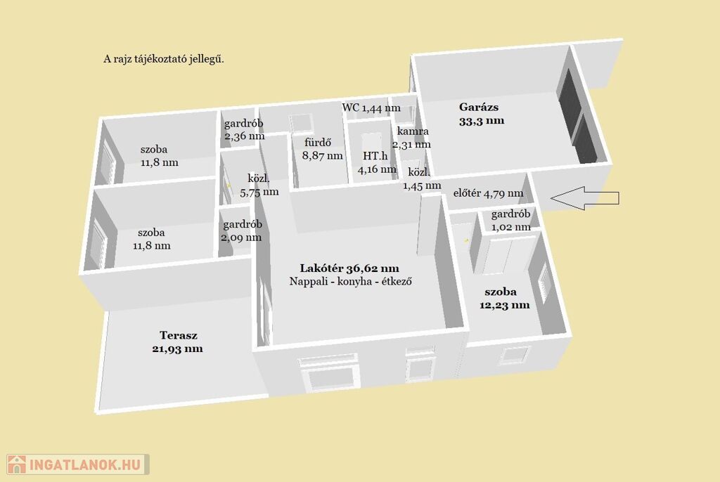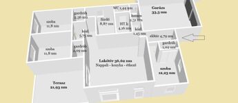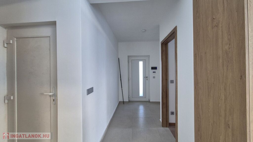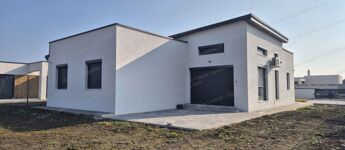 106,69 nm lakótér-nappali + 3 szoba, + 33,3 nm-es fűtött, dupla garázs, terasz + 21,93 nm. Telek: 654   nm.