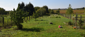 • ásott kút, fiatal termő gyümölcsfák a kertben.