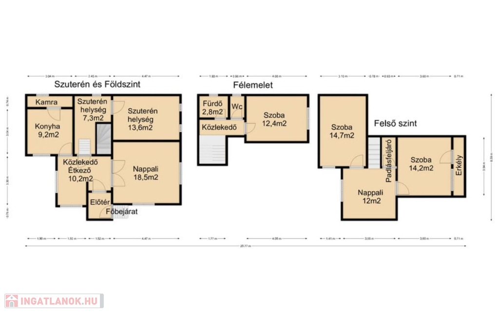 Felső szint: 2 külön bejáratú szoba, nappali, padlásfeljáró.