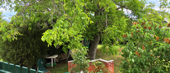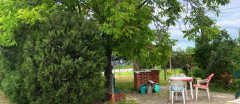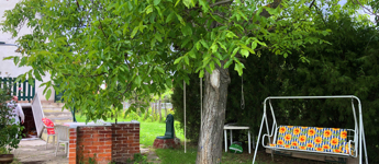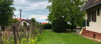 A házhoz tartozó kert is igazi kincs: egy hatalmas diófa gondoskodik a kellemes árnyékról a legmelegebb nyári napokon is, így a kerti pihenés, olvasás vagy beszélgetés mindig kényelmes lehet.