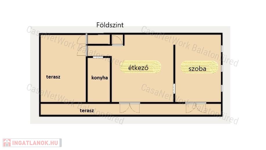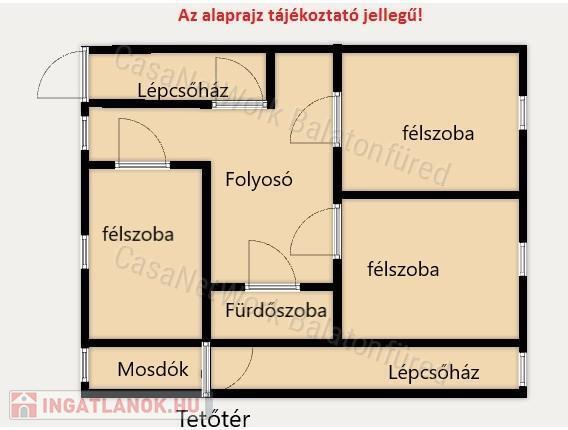 -az alsó szinten felszerelt konyha, tágas étkező, szoba található, míg a tetőtérben vannak a mosdók. Szintén a tetőtérben kialakításra került 3 félszoba, fürdőszoba WC-vel.