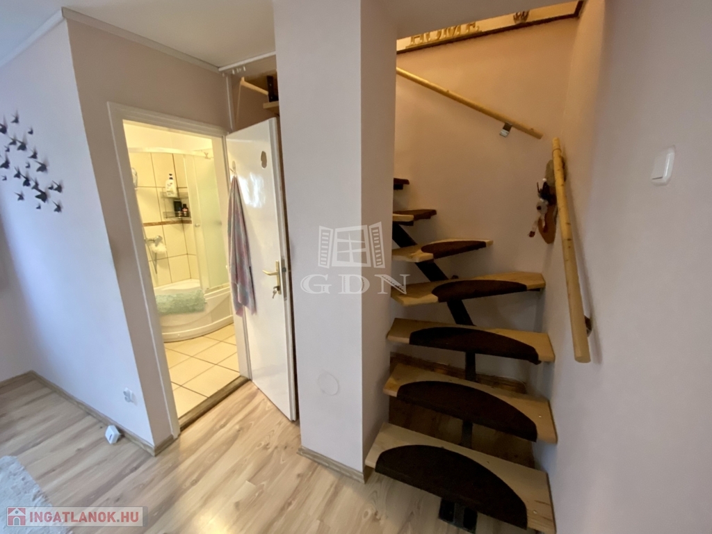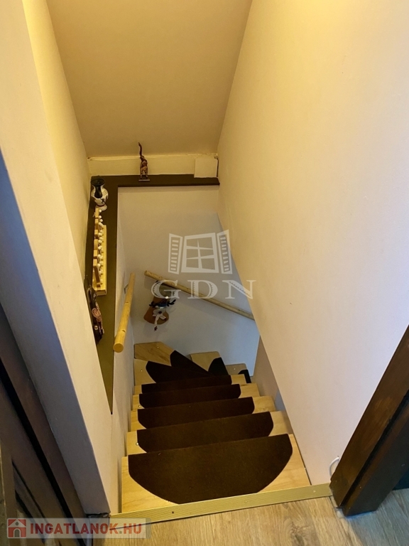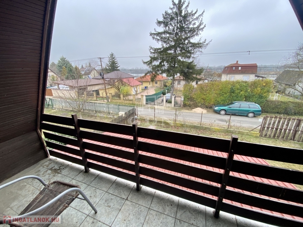 A 309 m²-es telken elhelyezkedő épület összesen mintegy 68 m² hasznos alapterülettel rendelkezik. Az alagsori szint 30 m²-es, ahol a konyha, egy szoba és egy kis helység került kialakításra. Itt található egy meghitt hangulatú cserépkályha és emelett elektromos fűtőtestek biztosítják a komfortot. A földszinten egy 24 m²-es lakótér található egy nappalival és egy fürdőszobával, amelyhez egy 10 m²-es terasz kapcsolódik; ezen a szinten gázkonvektor és elektromos fűtés gondoskodik a kellemes hőmérsékletről. A tetőtérben egy 10 m²-es szoba kapott helyet, valamint egy 4 m²-es terasz, ahonnan lenyűgöző panorámás kilátás nyílik a Duna holtágára és a környező természeti környezetre.