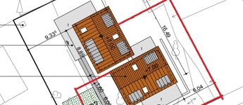 A 720 m2-es teljes telek területen két, egymástól jól elkülönített ház áll, amelynek nincs közös fala, a két épületet egy kis tárolóhelyiség köti össze. A két épület 6,00 x 8,96 m befoglaló alapterületű, egymástól tartószerkezetileg független, földszintes+ tetőteres, magas tetős, kétegységes üdülőépület, amely két család számára megfelelő térkapcsolatokkal rendelkezik.