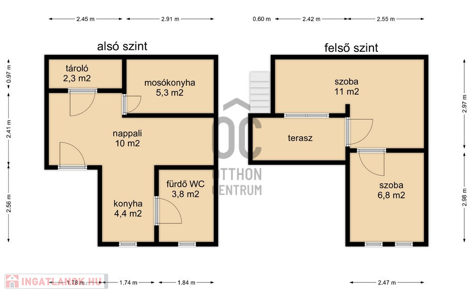 - A jó állapotú 44 m2-es ház felső szintjén két és fél szoba kapott helyet a felső szint külső lépcsőn közelíthető meg.