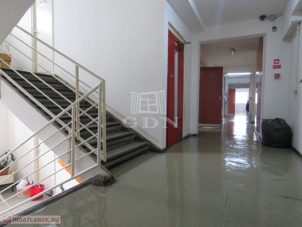 A földszint + 7 emeletes, összesen 3872m2 hasznos alapterületű, lifttel szerelt épület földszintjén recepció, iroda, raktárhelyiségek, mosoda, illetve kiszolgáló helyiségek találhatók.