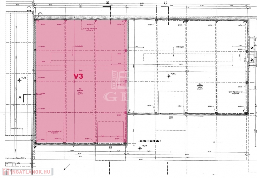 A raktár 25,6 x 34,5 méter alapterületű, belmagassága 4,5 - 8 méter