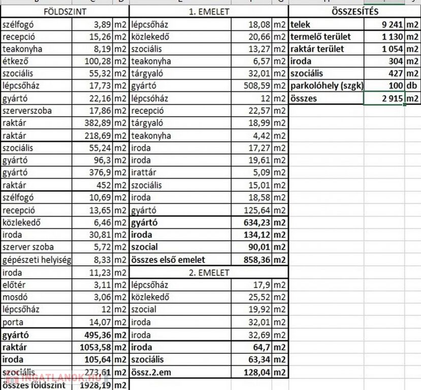 A 2.915 m2-es felépítmény földszinti kisebb részén (380m2) irodák és a dolgozók kiszolgálását biztosító szociális helyiségek találhatóak. A földszint nagyobb részét pedig 6 t/m2 padlóterhelhetőségű 2,8 m belmagasságú 495 m2-es, ESD padlóval ellátott gyártó, valamint a szintén 6 t/m2 padlóterhelhetőségű 8 m belmagasságú 1053 m2-es raktár csarnok foglalja el. A földszint a személyi bejáratokon kívül 4 db, 4m x 4,5m-es szintbeni szekcionált Hörmann ipari kapun keresztül közelíthető meg.