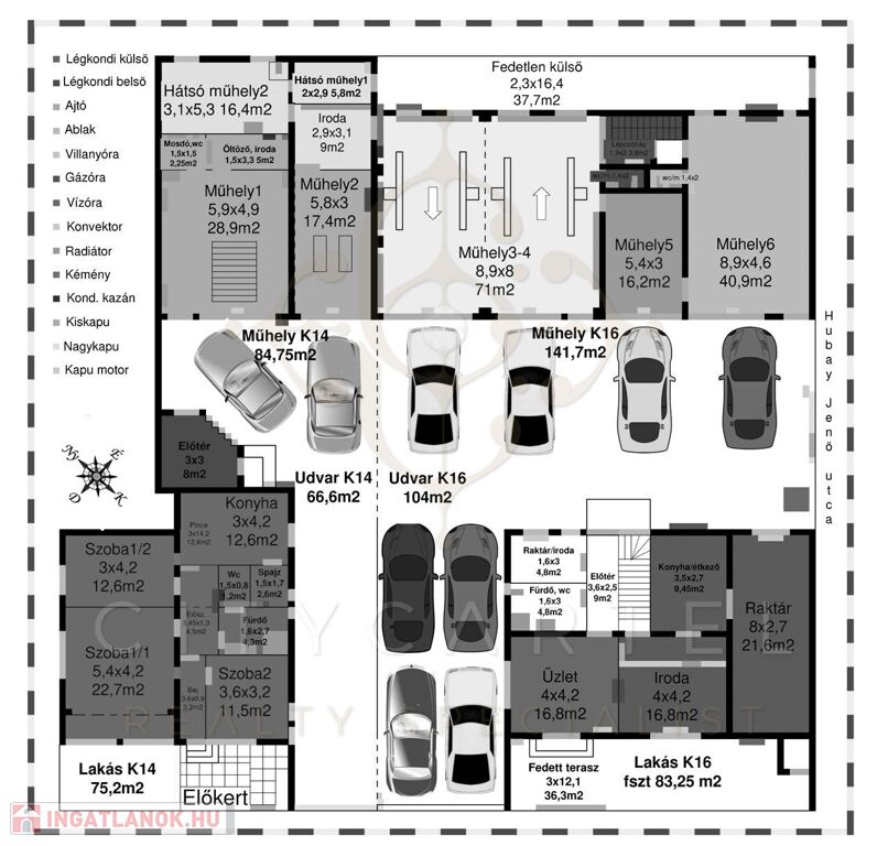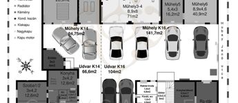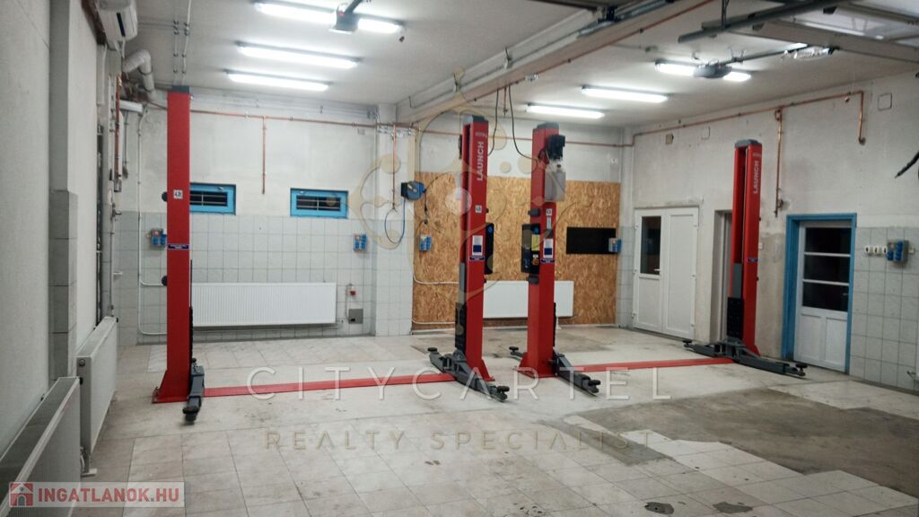 A hat állásos műhely jellemzői: 2 beállás csápos emelővel rendelkezik. Egy beálló aknás, egy küszöbemelős. Minden beálló motorizált, szankciós kapuval. Hűtő-fűtő 3,5 KW-os légkondik és kondenzációs kazán radiátorokkal. Levegőrendszer kiépített végpontokkal, egy aknában kompresszor telepítési hellyel. A műhelyhez irodahelyiségek, WC-k, mosdók, zuhanyzó, étkező és öltözőhelyiség tartozik.