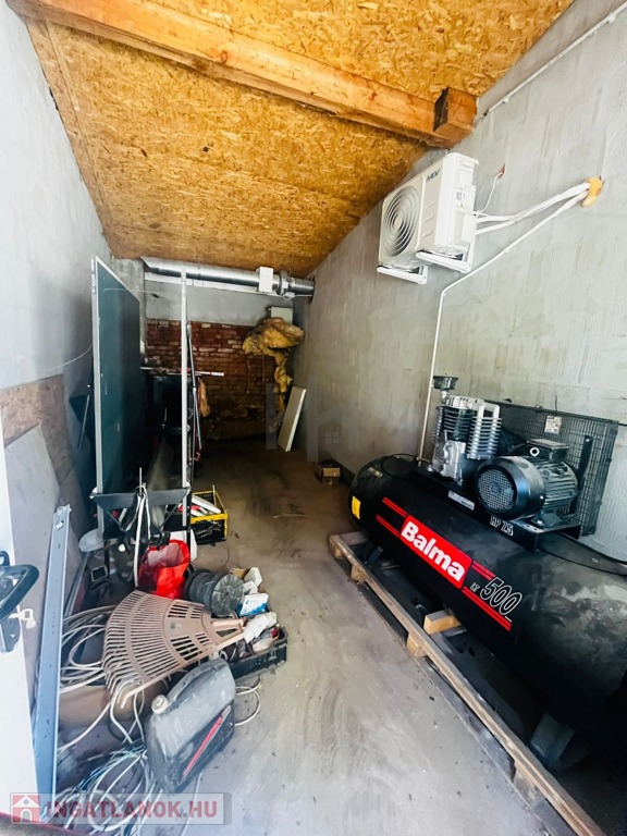 - a műhely részen a tető 6 éves (lemez), 2 éve lett vakolva, teljesen átvezetékelve, 3x32C típusú kismegszakítók (ipari áram), vegyes tüzelésű központi fűtés és klíma is található