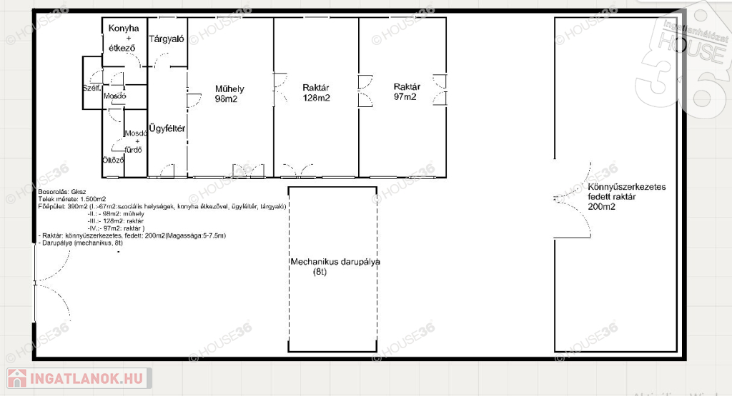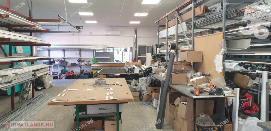 - Raktár: könnyűszerkezetes, fedett : 200 m2 (Magassága:5-7,5 m)
