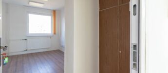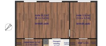 A két egymásból nyíló helyiségből álló iroda az irodaház 2. emeletén helyezkedik el. A helyiségek laminált padlóval burkoltak.