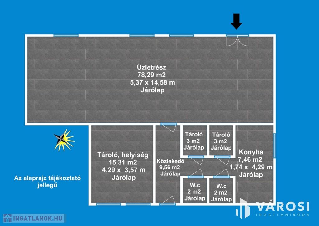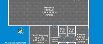 Az üzlethelyiség 1 db óriási üzletrésszel, 1 db helyiséggel (irodarész tároló), 2 db külön Wc-vel, közlekedővel, konyharésszel rendelkezik. Az ingatlan elhelyezkedésre, kialakítása miatt rendkívül sokrétű a felhasználása, amely maximálisan kiemeli ezt az ingatlant az átlagos üzlethelyiségek sorából és egyedülálló választássá teszi azt.