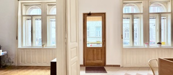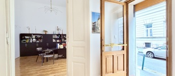 Az iroda két legnagyobb alapterületű helyisége (~50 nm), négy nagyméretű ablakkal, és a bejárati ajtóval együtt, az utcafront felé néz, a külön mosdó és az ablakos étkezős konyha a belső udvar felé került kilakatásra.