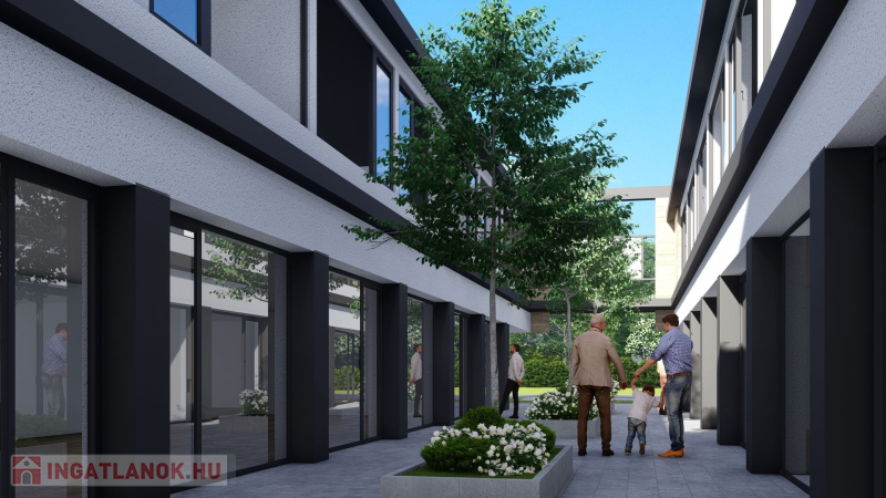 - térkővel burkolt közös udvar, növényzettel, pihenővel
