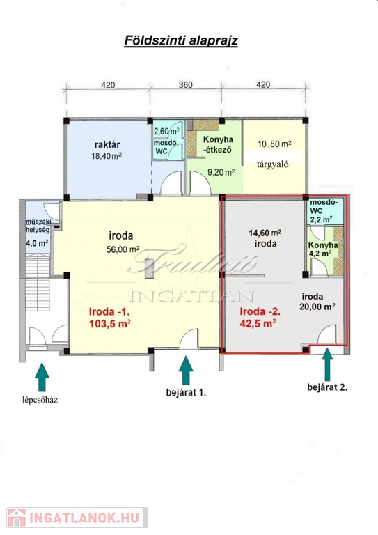 Az épület 147 m2-es frissen felújított alsó szintjén egy 103,5 m2-es és egy 42,5 m2-es két külön bejárattal rendelkező iroda lett kialakítva, melyek igény esetén összevonhatók.