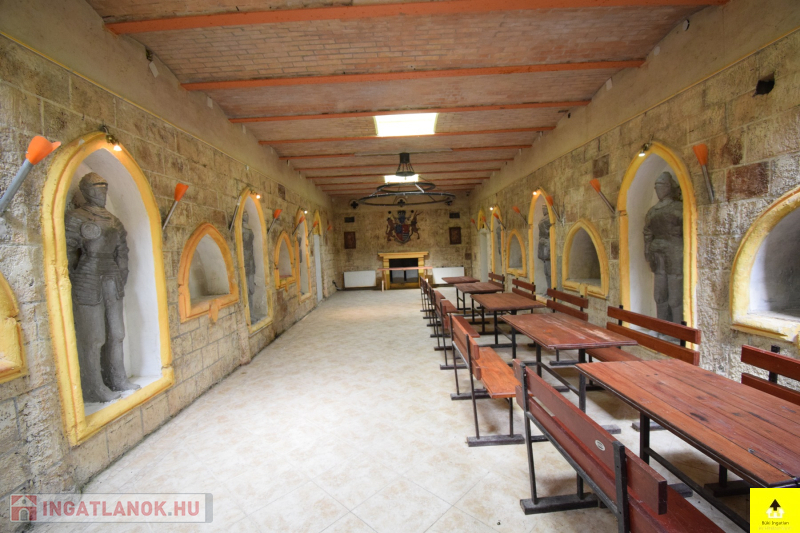 Különleges hangulatú, autentikus lovagterem: ódon páncélos szobrok, zászlók, fáklyák, trónszékek, kovácsoltvas csillárok – középkori miliő
