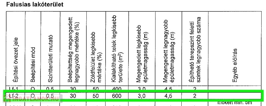 A telek "falusias lakóövezetben" helyezkedik el. Az övezetre jellemző, főbb beépítési paraméterek: