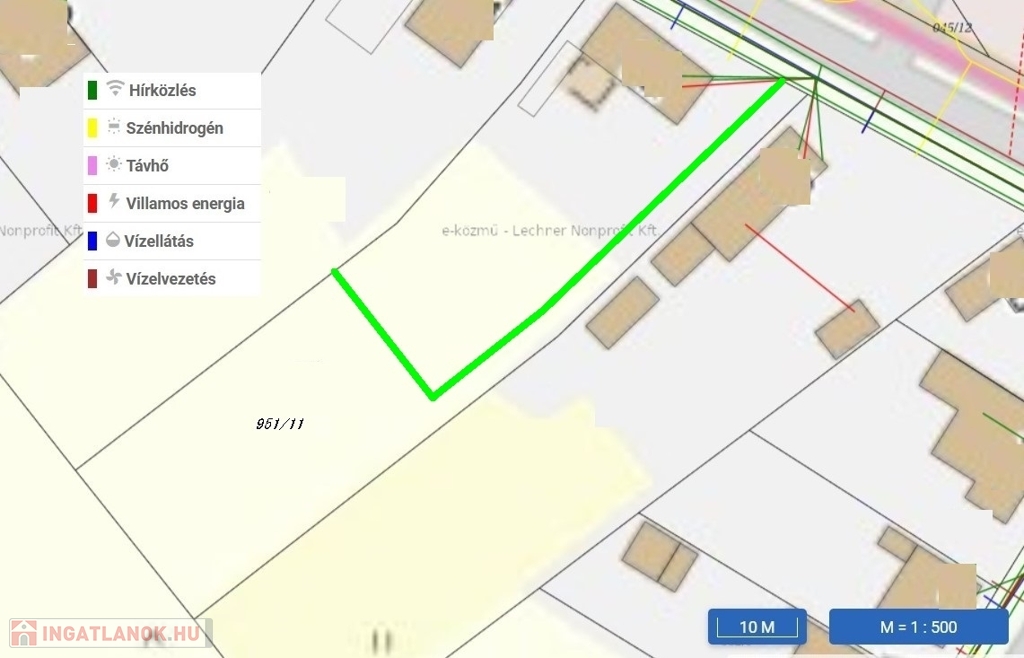 Az 1152 m2-es telek egy a telek részét képező 3,5 m széles, cirk. 55 m hosszú úton keresztül közelíthető meg. Ezáltal az utca zajától távol tud elhelyezkedni a ház. A fotók között látható közműtérképen, zölddel jelölt telekhatárra az eladó magas betonelem kerítést épít, a privát szféra megőrzése miatt. A telekhatár többi része dróthálóval kerített..