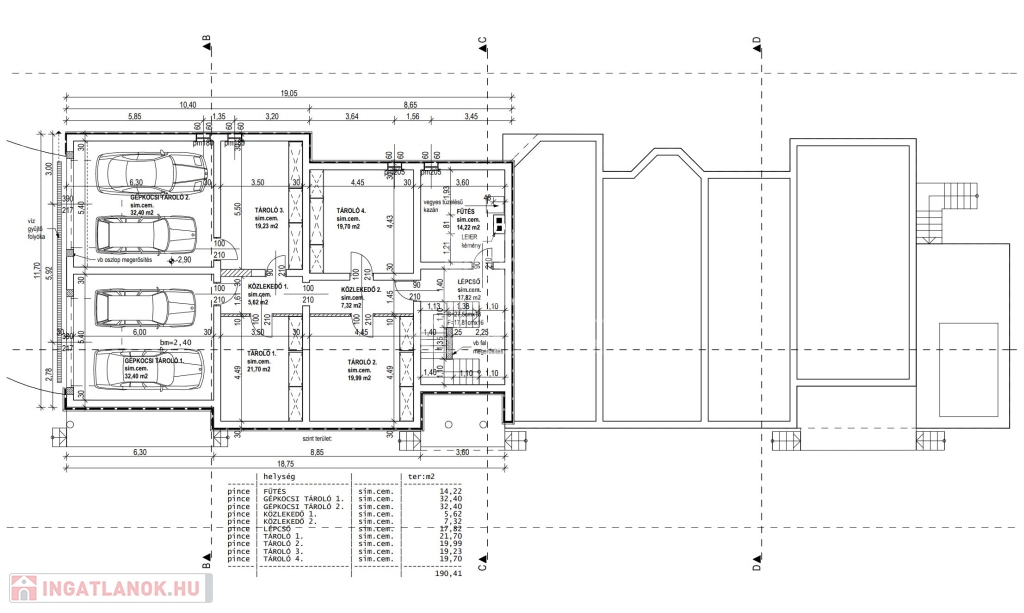 A lakások nettó lakóterülete 159 m2 és 174 m2, a pince szinten pedig mindkét lakás számára tároló helyiségek és garázsok lettek tervezve, melynek területe 190 m2.