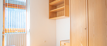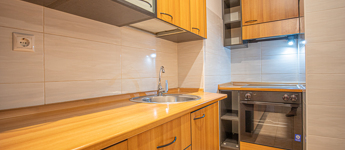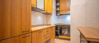 A lakás részben bútorozott és gépesített: több beépített szekrény, asztal, székek, hűtő.