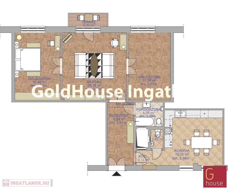 A 99nm-es lakás egy szépen felújított, liftes társasház 2.emeleten található.
