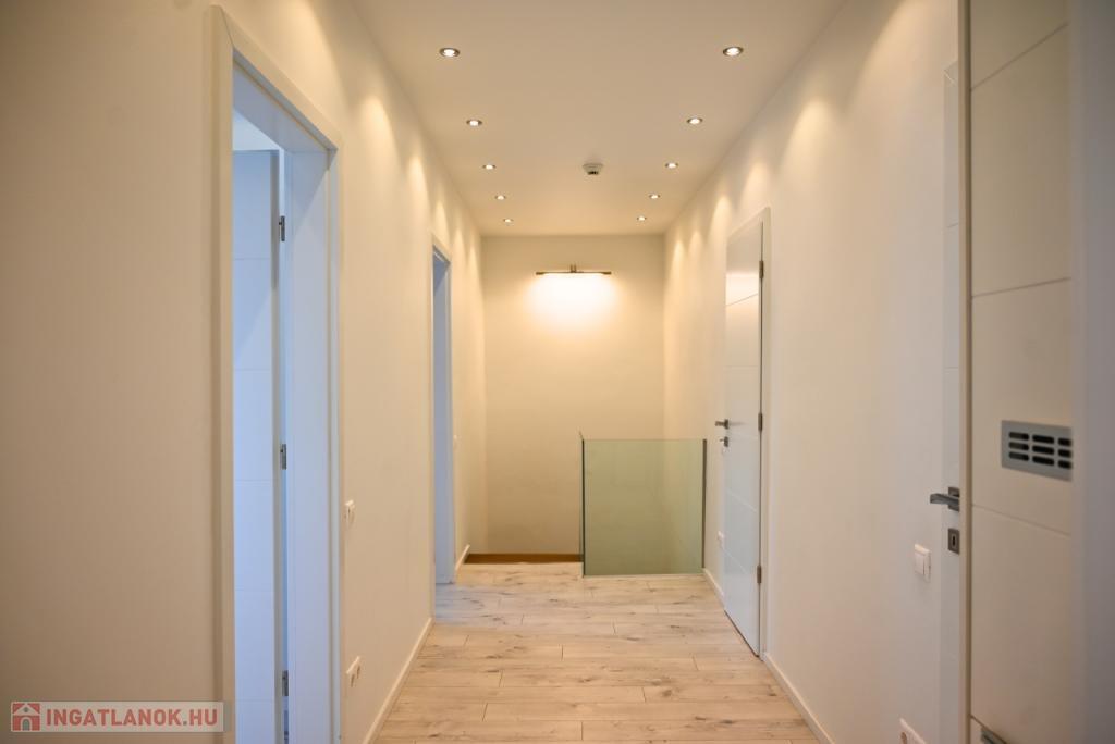 Alsó szint: tágas, amerikai konyhás nappali, beépített bútorokkal és modern gépekkel felszerelve, külön WC kézmosóval.