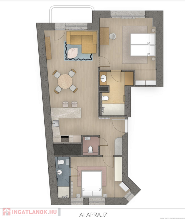 2 külön nyíló hálószoba. Mindkét hálószobából közvetlen fürdőszoba nyílik zuhanyzóval és WC-vel, valamint külön vendég-WC. Az egyik hálószobában egy dupla ágy, míg a másikban két egyszemélyes ágy található.
