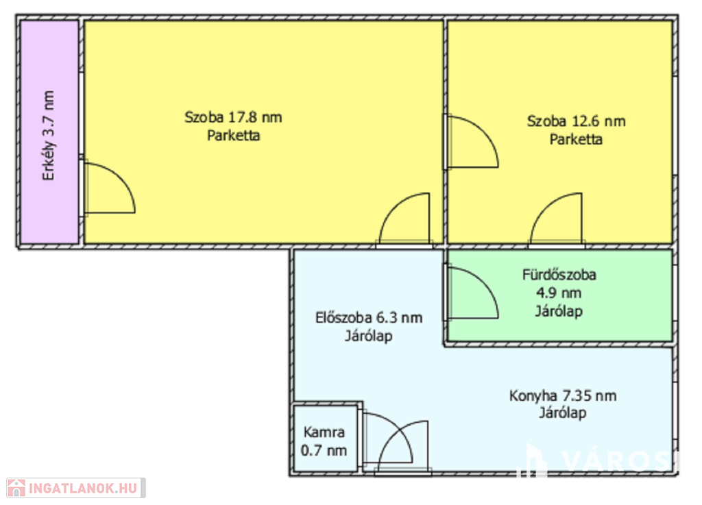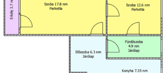 A lakásban 2 szoba, konyha, kamra, előszoba, fürdőszoba, erkély található.