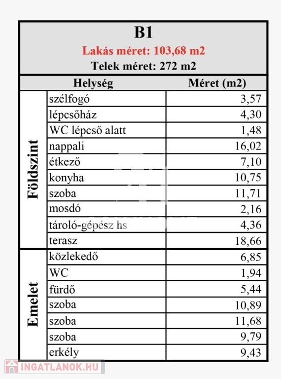 - HASZNOS ALAPTERÜLETE (emelettel együtt): 103,68 m2