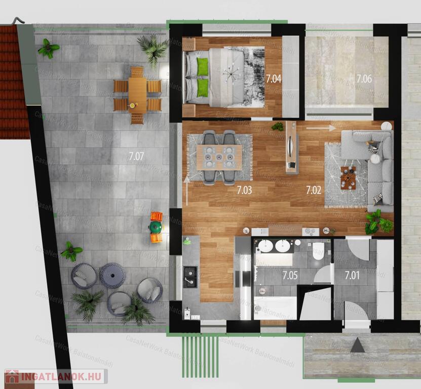 - 59,91 m2 lakótér + 8,6 m2 loggia + 45,91 m2 terasz